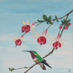 2009Een kolibri zit op de tak van een fuchsia. Samen een kleurrijk geheel.
