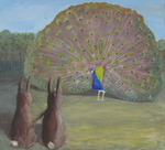 2011De 2 hazen verbazen zich erover dat de pauw plotseling vele malen groter en kleuriger is geworden.